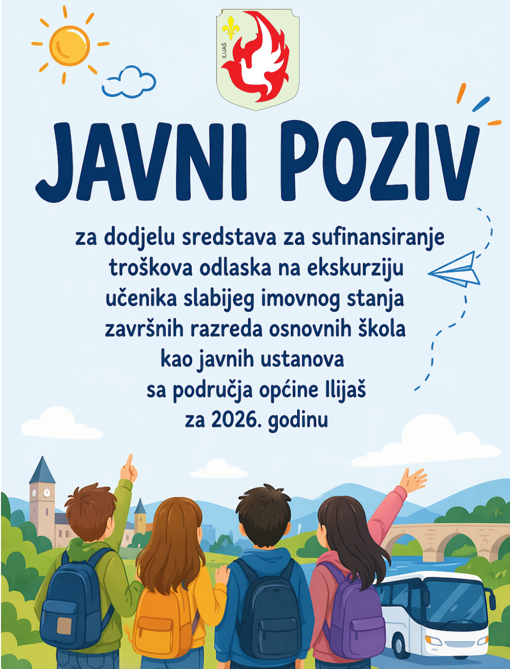 Općina Ilijaš objavila je Javni poziv za dodjelu sredstava za sufinansiranje troškova odlaska na ekskurziju učenika završnih razreda osnovnih škola kao javnih ustanova, a koji dolaze iz porodica slabijeg imovnog stanja za 2026. godinu.