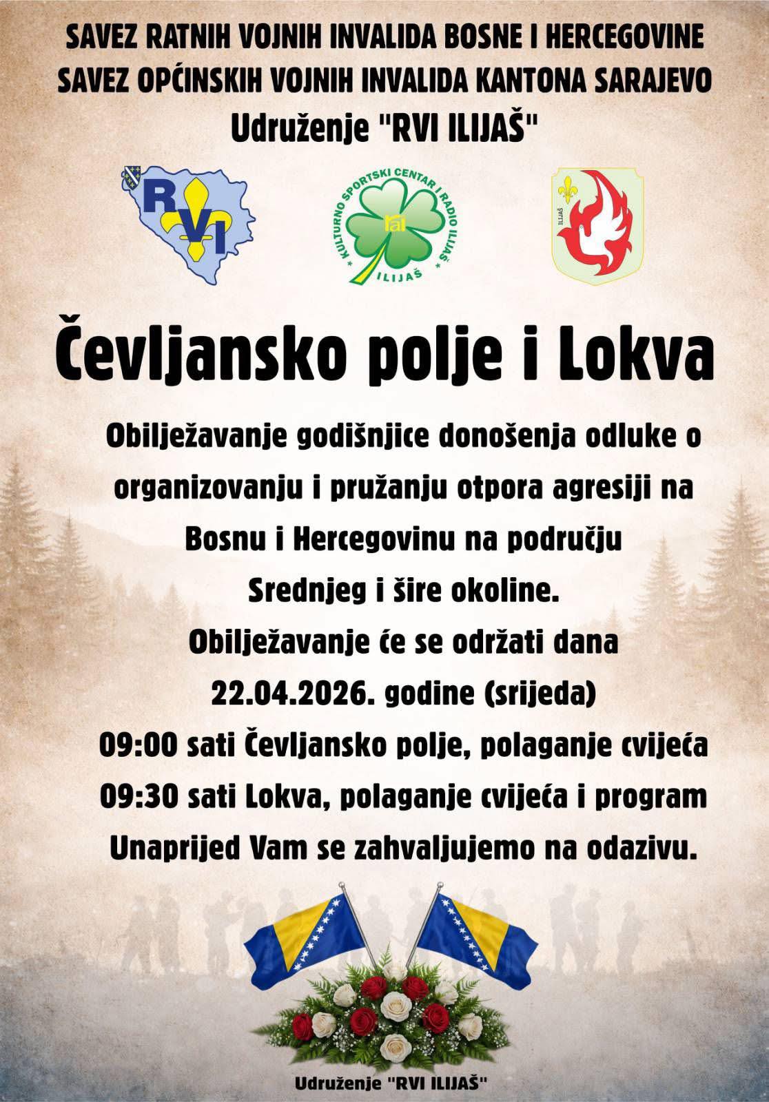 Savez ratnih vojnih invalida BiH, Savez općinskih vojnih invalida KS, Udruženje RVI Ilijaš uz podršku Općine Ilijaš i JU KSC i Radio Ilijaš organizuje obilježavanje 22. aprila i 34. godišnjice donošenja odluke o organizovanju i pružanju otpora agresiji na Bosnu i Hercegovinu na području Srednjeg i šire, uključujući i dijelove općina: Vareš, Olovo, Sokolac i Vogošća na lokalitetu Čevljansko polje i Lokva, općina Ilijaš.