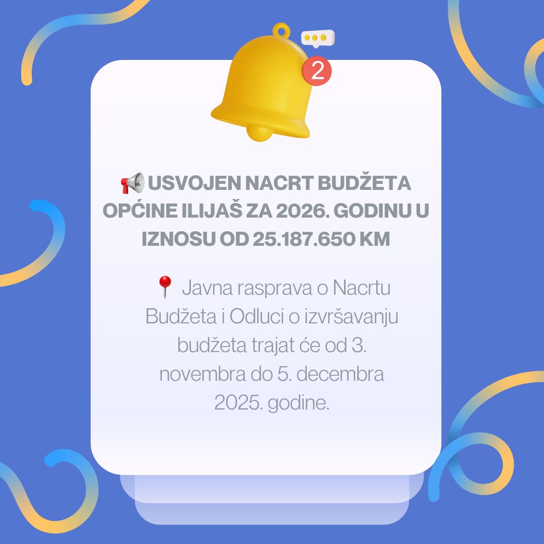 Na 12. redovnoj sjednici Općinskog vijeća Ilijaš održanoj dana 31.10.2025. godine, Općinsko vijeće Ilijaš usvojilo je Nacrt Budžeta Općine Ilijaš za 2026. godinu i Nacrt Odluke o izvršenju Budžeta za 2026. godinu.