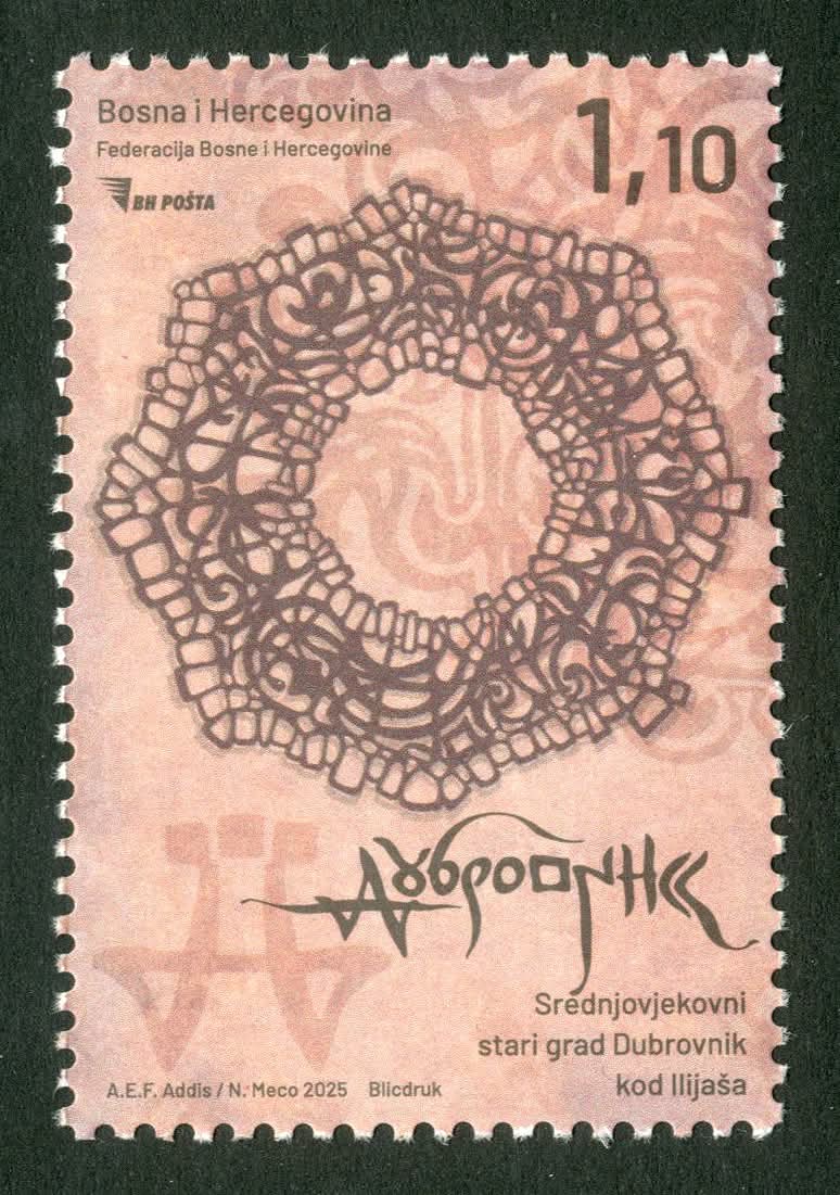 Poštanska marka, koja je 14. novembra započela svoj filatelistički put širom svijeta, nominalne je vrijednosti 1,10 KM, a dizajnirali su je prof. dr. Adis Fejzić i Nedim Meco, članovi Fondacije. Na vizualu marke metaforično je predstavljen tlocrt istočne oktogonalne kule starog grada Dubrovnika, čiji su kameni slojevi iscrtani u maniri arabeske, kaligrafije i bosančice. U dizajnu se pojavljuje i stilizirano slovo „D“, snažan simbol autentičnog identiteta srednjovjekovne Bosne.