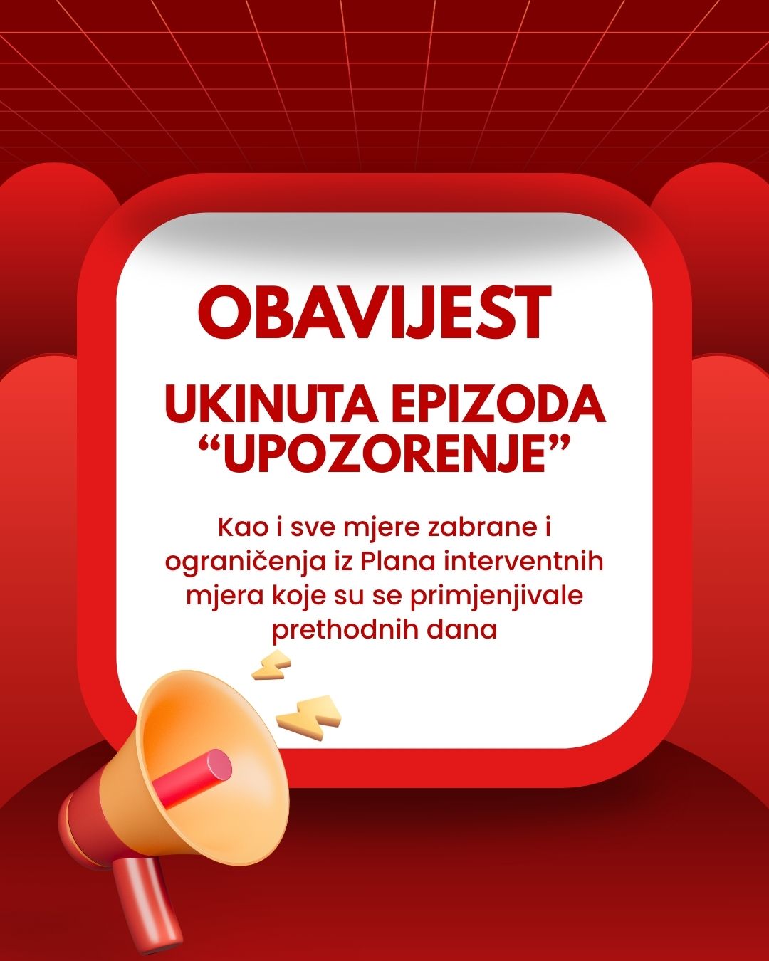 Ministarstvo apeluje na građane da prate preporuke Zavoda za javno zdravstvo i smanje kretanje na otvorenom, a poslodavce podsjeća na obavezu osiguranja zaštite radnika koji rade vani. Podsjećamo, na snazi je trenutni Plan interventnih mjera koji je dostupan na linku: https://mkipgo.ks.gov.ba/mjere. Novi, inovirani Plan stupit će na snagu za nekoliko dana, nakon objave u Službenim novinama KS.