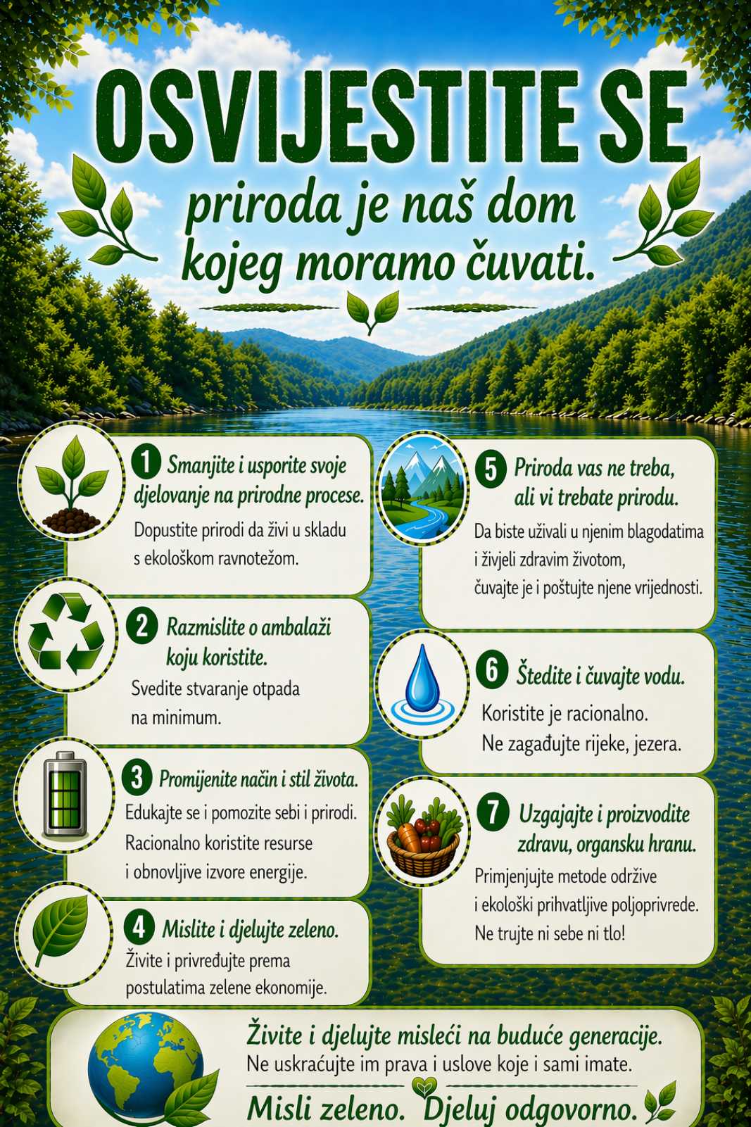 Zrak koji dišemo, voda koju koristimo i priroda koja nas okružuje zajednička su odgovornost svih nas. Čuvajmo prirodu, zelene parkove i čistu atmosferu. Neka obale naših rijeka krase zelenilo i rastinje, a ne smeće.
