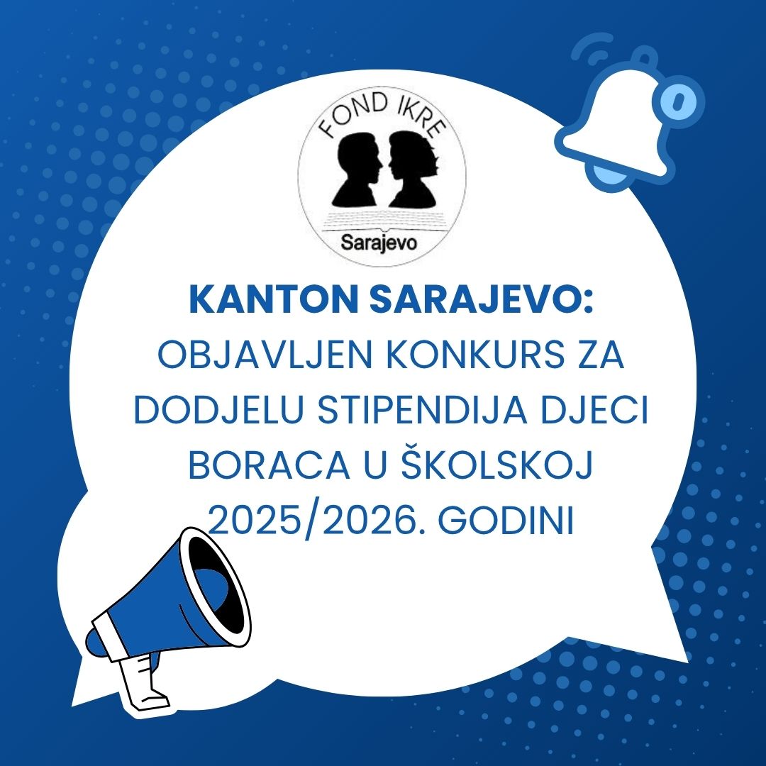 Ministarstvo za boračka pitanja Kantona Sarajevo u saradnji da Fondom Kantona Sarajevo za stipendiranje i školovanje djece boraca, poginulih boraca i poginulih civila – žrtava rata IKRE i ove školske 2025/26 raspisuje konkurs za stipendiranje učenika i studenata sa područja Kantona Sarajevo, a koji ovo pravo ostvaruju u skladu sa zakonskim propisima.