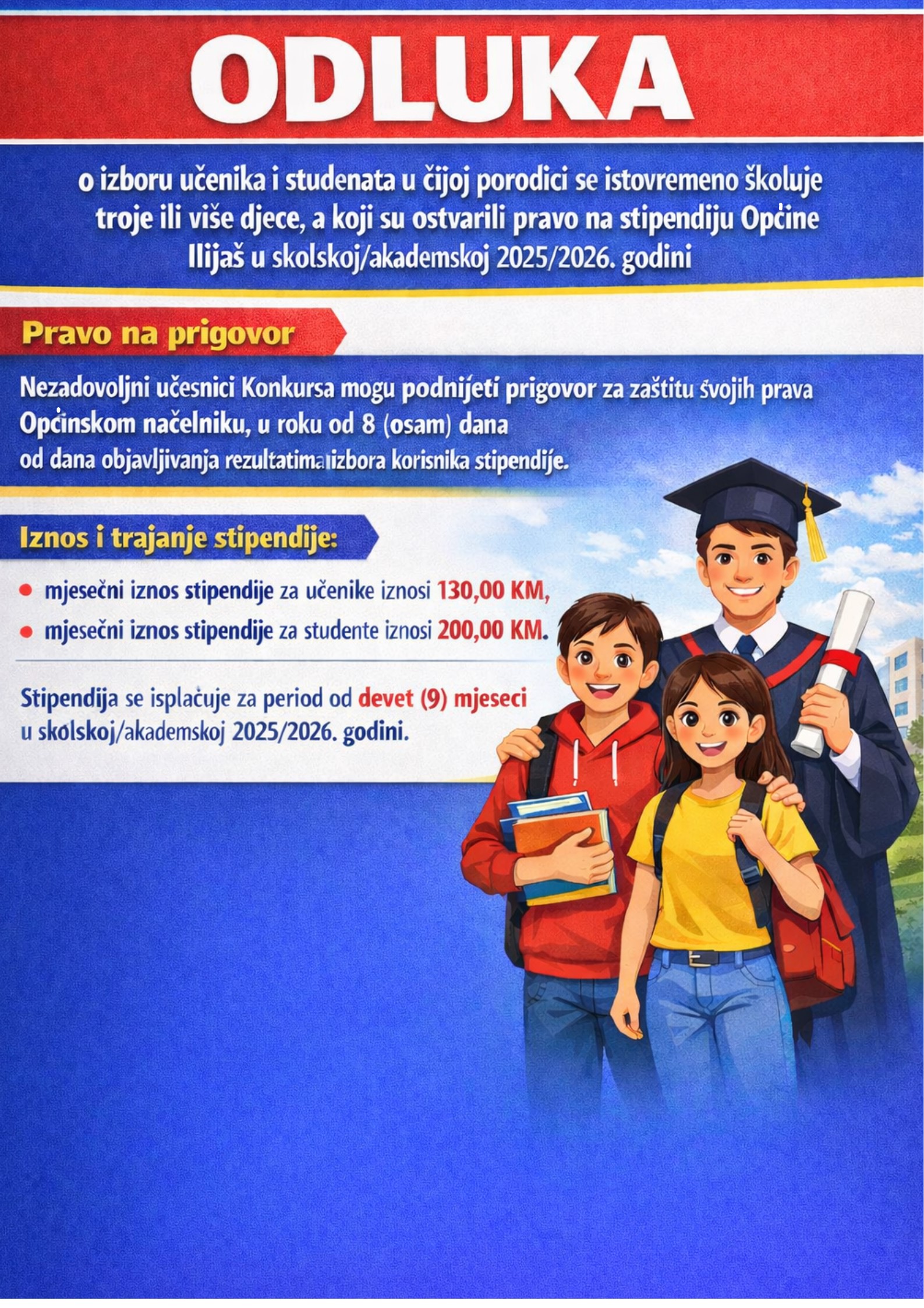 Na osnovu člana 107. Statuta općine Ilijaš (“Službene novine Kantona Sarajevo“, br. 20/09-prečišćeni tekst i 46/18), člana 7. Pravilnika o stipendiranju i nagrađivanju izuzetno nadarenih učenika i studenata („Službene novine Kantona Sarajevo“, br. 2/16 – prečišćeni tekst, 40/21, 50/22, 43/23, 10/25 i 14/25) i prijedloga Komisije za izbor izuzetno nadarenih učenika i studenata, korisnika općinske stipendije u školskoj/akademskoj 2025/2026. godini, Općinski načelnik donosi: ODLUKU o izboru učenika i studenata u čijoj porodici se istovremeno školuje troje ili više djece, a koji su ostvarili pravo na stipendiju Općine Ilijaš u školskoj/akademskoj 2025/2026. godini