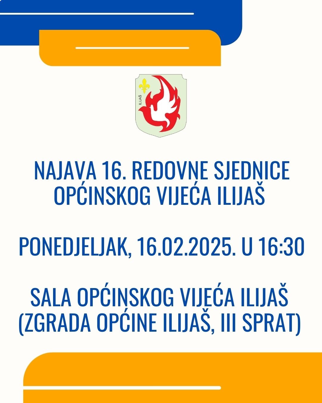 Redovna sjednica Općinskog vijeća Ilijaš će biti održana dana 16.02. (ponedjeljak) 2026. godine sa početkom u 16:30 sati, u sali Općinskog vijeća Ilijaš (zgrada Općine Ilijaš, III sprat) sa sljedećim