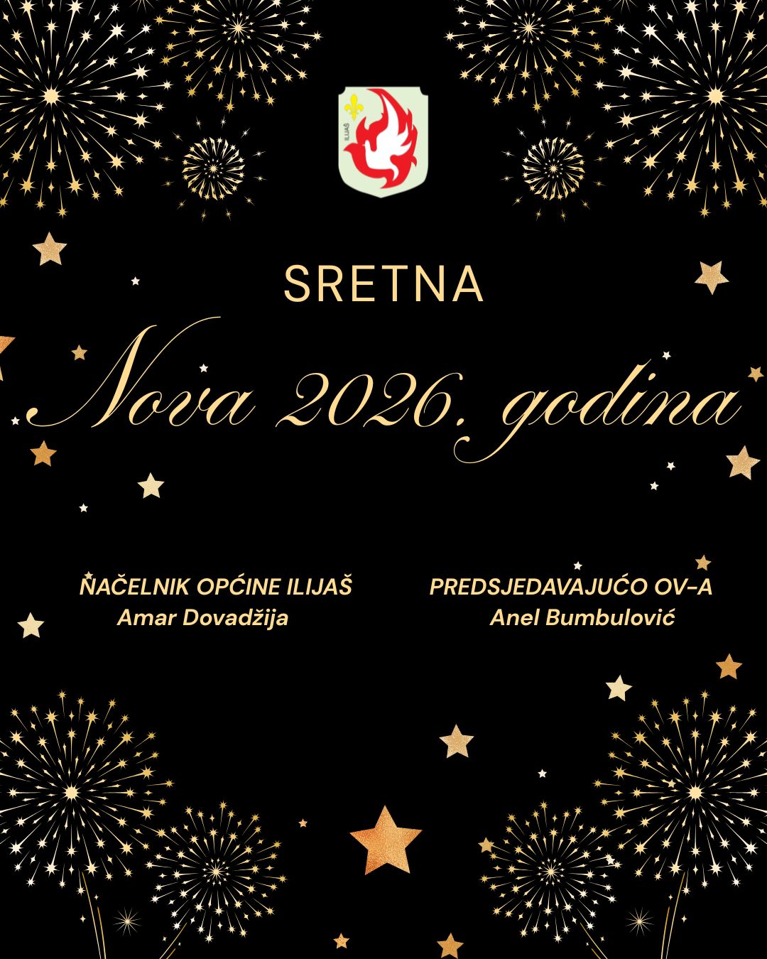 "Poštovane građanke i građani općine Ilijaš, povodom Nove godine upućujemo vam iskrene čestitke sa željom da naredna godina bude ispunjena zdravljem, mirom, ličnim i porodičnim uspjesima.