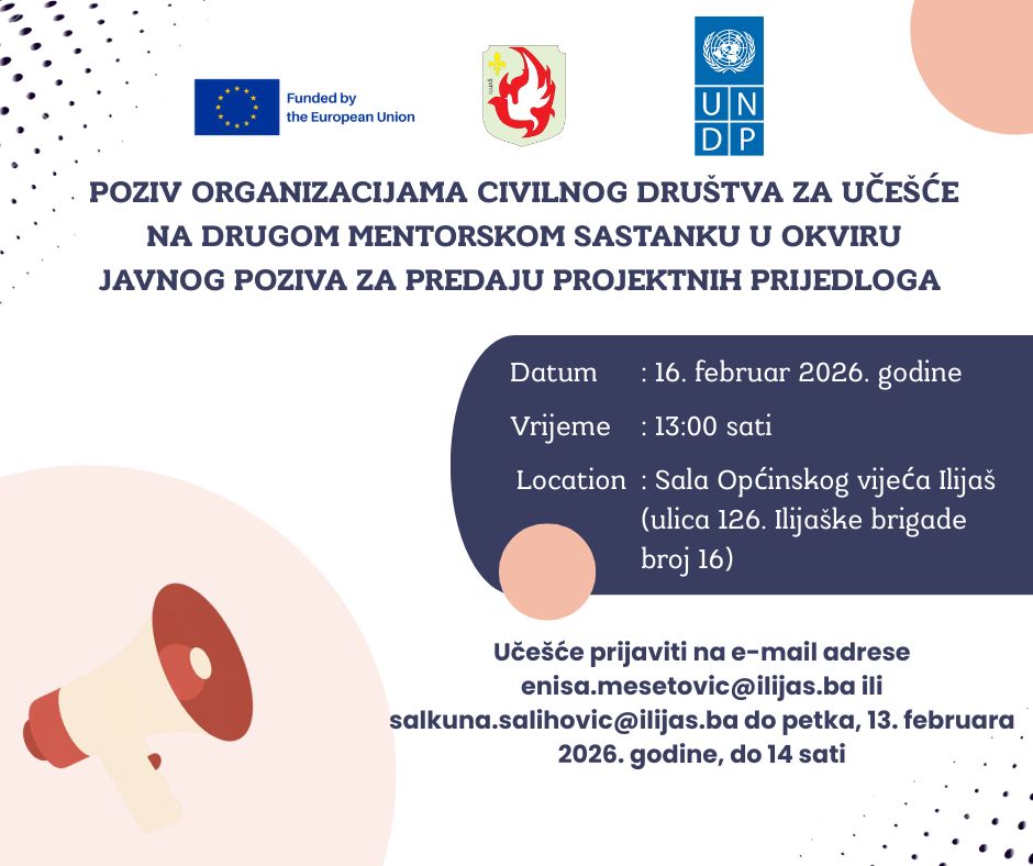 Drugi mentorski sastanak će biti održan u ponedjeljak, 16. februara 2026. godine, s početkom u 13 sati, u Sali Općinskog vijeća Ilijaš (ulica 126. Ilijaške brigade broj 16).