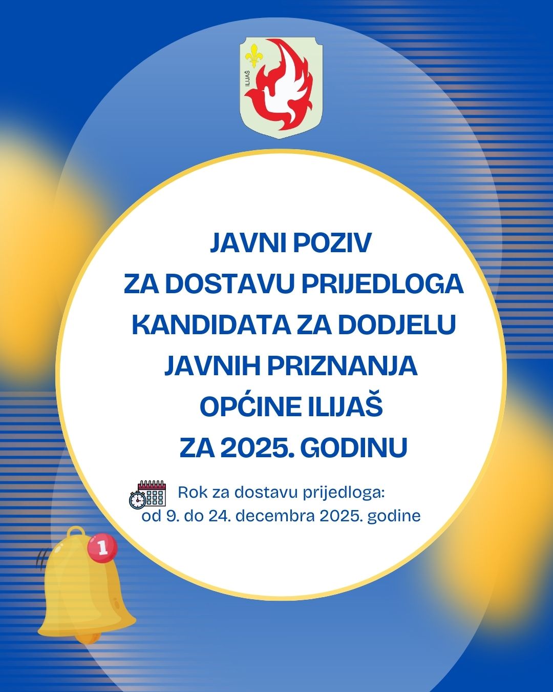 Komisija za javna priznanja, obilježavanje historijskih događaja i ličnosti i zaštitu kulturnog i prirodnog naslijeđa Općinskog vijeća Ilijaš, održala je sjednicu dana 03. 12. 2025. godine, te u skladu sa članom 14. Odluke o priznanjima Općine Ilijaš, upućuje Javni poziv za dostavu prijedloga kandidata za dodjelu javnih priznanja Općine Ilijaš za 2025. godinu.