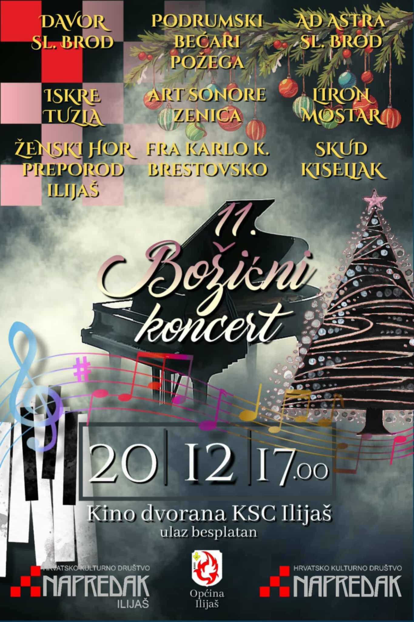 Hrvatsko kulturno društvo Napredak Ilijaš i Općina Ilijaš pozivaju građane na tradicionalni 11. Božićni koncert koji će se održati u subotu, 20. decembra u 17 sati u kino dvorani Kulturno-sportskog centra Ilijaš.