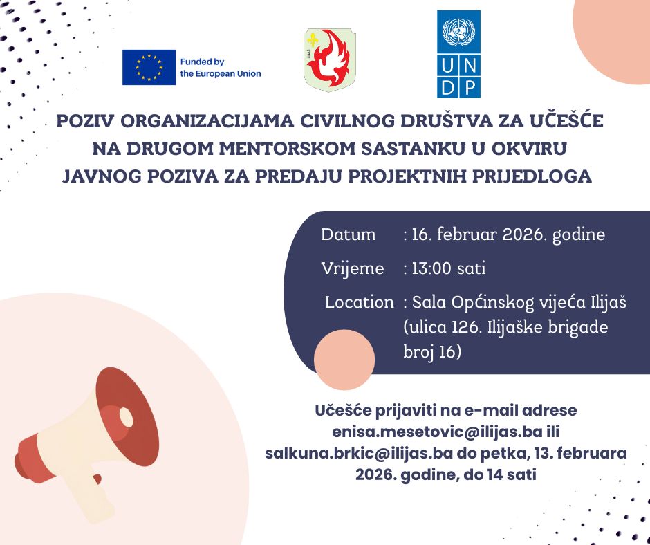 U okviru Javnog poziva za organizacije civilnog društva/nevladine organizacije za predaju prijedloga projekata, koji se provodi u sklopu programa „Regionalni program lokalne demokratije na Zapadnom Balkanu“ (ReLOaD3) u saradnji sa Općinom Ilijaš, u četvrtak (5. februara 2026. godine) od 16 do 19 sati, održan je prvi mentorski sastanak za zainteresovane predstavnike/ice organizacija civilnog društva (OCD). Prvi mentorski sastanak održan je u prostorijama Općine Ilijaš i bio je prilika da predstavnici/e OCD-a s mentorima javno diskutuju o nedoumicama i dilemama u okviru pripreme projektnih prijedloga.