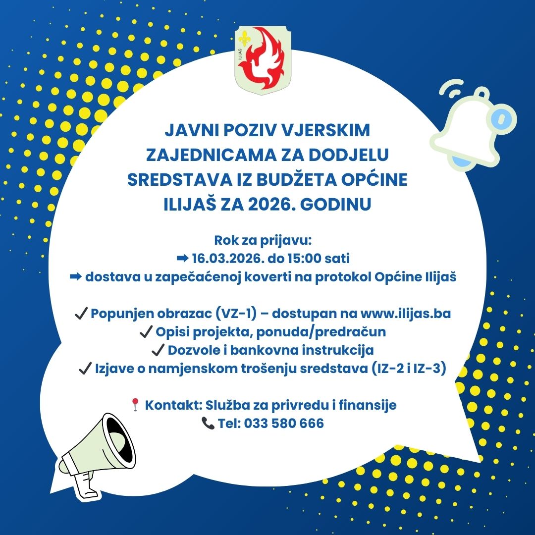 KOMPLETAN TEKST JAVNOG POZIVA, IZJAVA I ZAHTJEV MOŽE SE NAĆI NA LIKU: https://ilijas.ba/index.php/javni-pozivi/javni-poziv-za-prikupljanje-zahtjeva-vjerskih-zajednica-radi-dodjele-sredstava-za-finansiranje-sufinansiranje-iz-budzeta-opcine-ilijas-za-2026-godinu