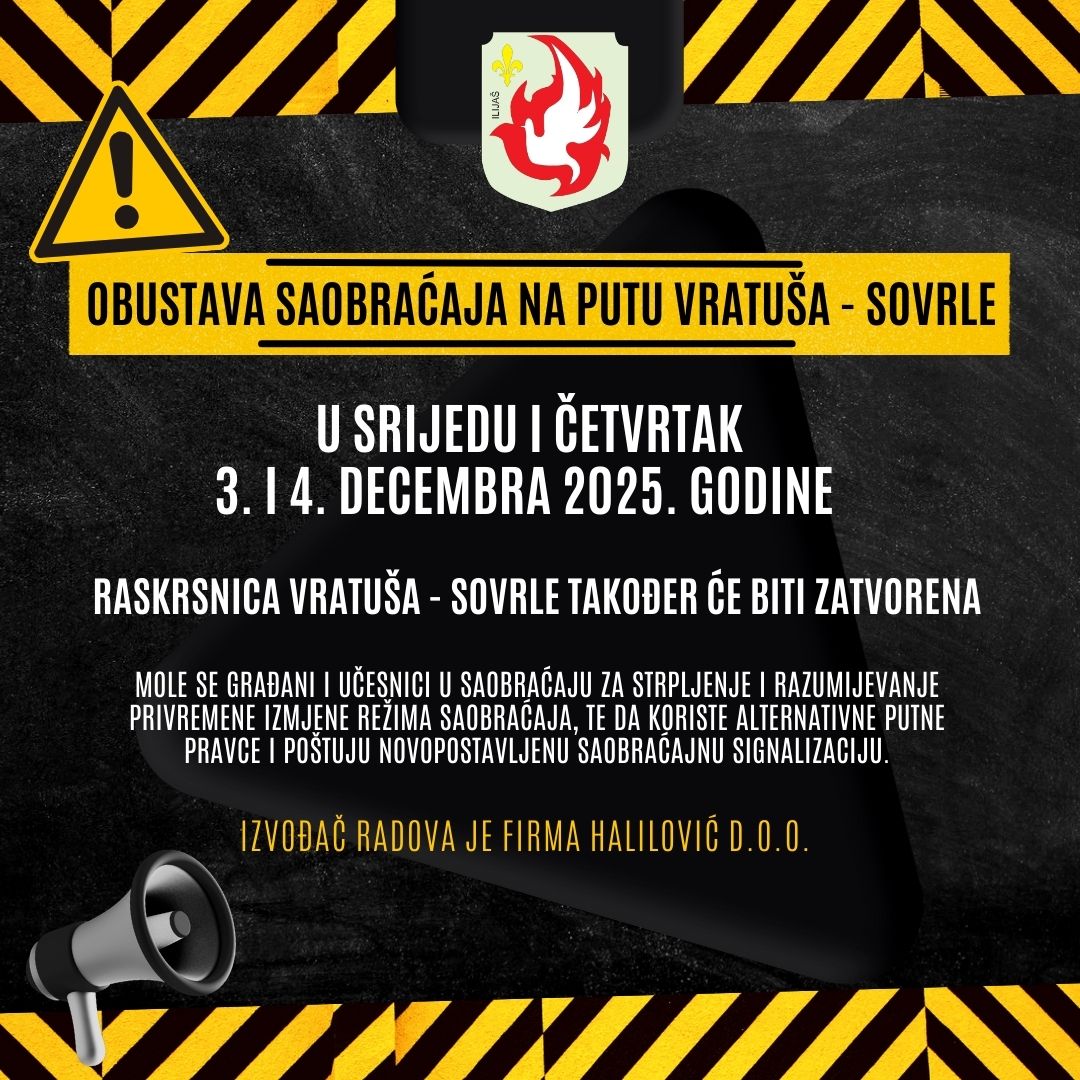 Obustava je na snazi zbog izvođenja radova asfaltiranja, a tokom asfaltiranja napominjemo da će i raskrsnica Vratuša - Sovrle također biti zatvorena.